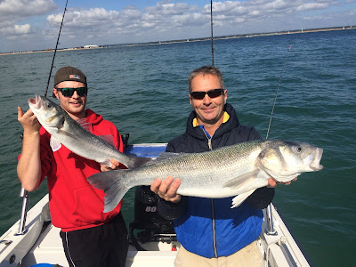 Father and son team, Mark and Sam Quilliam with a cracking double hook up of Bass caught on Savage Gear lures during a drift in the Solent on their own boat, Starfish!